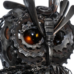 Made from glass, cutlery, mechanical salvage, retired tools, motorbike sprockets, bicycle spokes, gears and chain.
