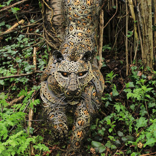 Made from bicycle gears, motorbike spokes, break-disks, and forklift drive chain links. Bespoke made amber glass eyes.